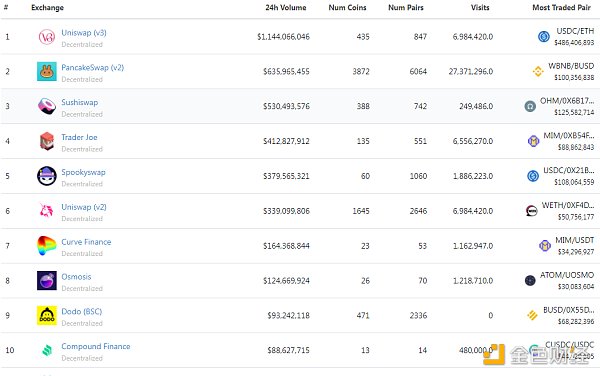 過去24小時去中心化交易所的交易量 數據來源:Coingecko