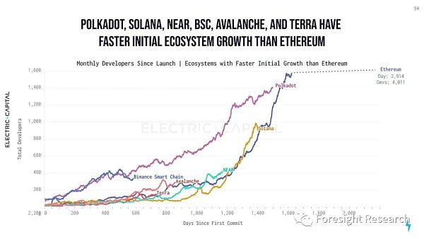 我們還考慮了基于市值的前10個 Layer1, 從第 1 次公開代碼提交的日期為基準, Polkadot, Solana, BSC, Near, AVAX, Terra 的增長速度比 Ethereum 快.