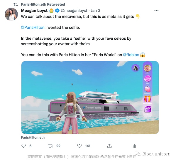 參與度、獎勵和忠誠度的交集——尤其是對于品牌和創作者:2021 年,我們看到許多品牌以各種方式躍入元界。雖然有些人專注于較短的事件或體驗,但我認為許多人會更認真地考慮在元宇宙中更永久的存在——他們需要技術來幫助他們激勵他們的數字社區。也許它可以將 IRL 與在元宇宙中的支出與品牌相關聯并以這種方式獎勵客戶,或者根據參與度創建對某些事件的分層訪問。我認為普通的品牌/IP 持有者將很難駕馭這一點,行業的即插即用解決方案將會出現。擁有大量追隨者、社區和個人品牌的創作者和名人也可以在元宇宙中取得成功(正如我們在史努比狗狗身上看到的那樣,和其他人,比如帕麗斯希爾頓,她在她自己的“巴黎世界”在 Roblox 上舉辦了一個新年前夜活動——我參加了!)——類似的概念和挑戰也適用,我很想看到更多能夠實現大規模采用的解決方案。前幾天我在 Twitter 上發布了關于 Paris Hilton 在 Roblox 上的存在以及自拍在元宇宙中的重要性/她在其中的角色——想想她如何在元宇宙中圍繞自拍激活她的社區,并從中創造一種體驗,無論是在 Roblox 生態系統內部還是外部(正如巴黎所說......那很熱)。連接世界并讓忠誠發揮作用將是巨大的。