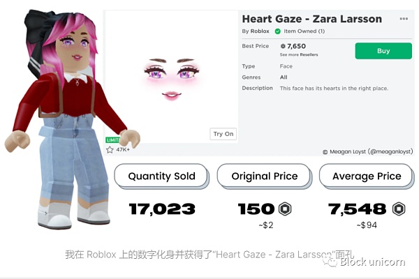 從理論上講,品牌在元宇宙中貨幣化的潛力是無限的。對于消費者而言,加班獲得的皮膚/收藏品的價值存在真正的上升潛力——元宇宙創造了一個真實的、有形的轉售經濟,任何年齡的用戶都可以從中獲利。我最喜歡的例子是 Roblox 上的數字 Gucci 包,轉售價超過4,000 美元(超過IRL版本)在Gucci Garden體驗之后。我什至在 Roblox 上裝飾我*非常可愛*的個人頭像時也經歷過這種情況,如下圖所示 - Roblox x Zara Larsson 合作創建的“Heart Gaze” 臉型供應有限,而且價格飛漲在二級市場。在購買這張特定“面孔”時看到其價值的用戶已經能夠通過出售它獲得 50 倍的利潤,并且希望價值會繼續上漲,因為只有 17,000 件的有限供應。