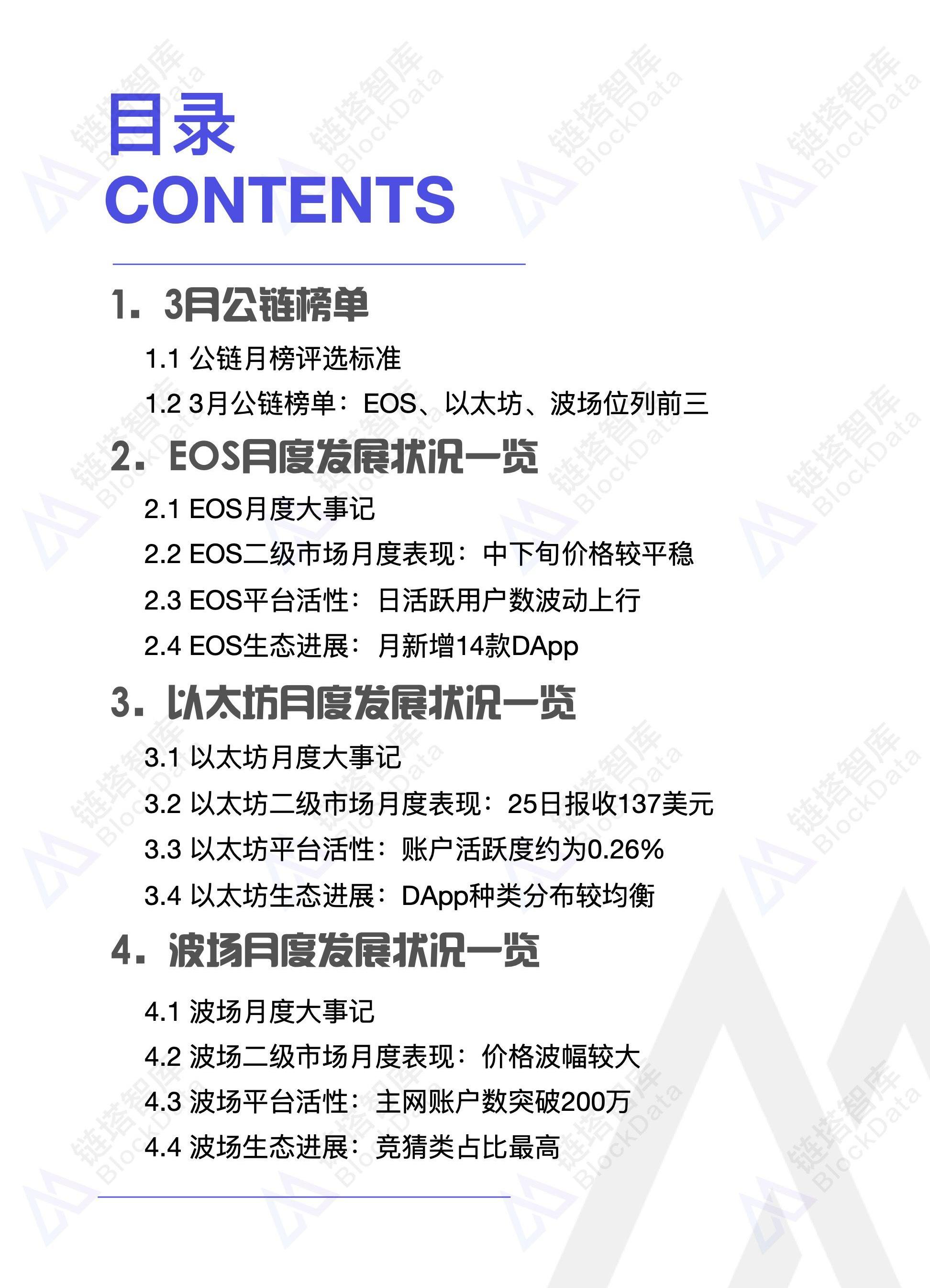 XRP/HKD-4.02%前言公鏈是指任何人都可以讀取、發送交易且交易能獲得有效確認的、也可以參與其中共識過程的區塊鏈。公有鏈之于區塊鏈世界,相當于Windows之于電腦,即公有鏈是區塊鏈世界中的操作系統,是區塊鏈世界的基礎設施。公鏈作為區塊鏈世界里的基礎設施,主要用來拓展性能或為商業應用提供服務支撐,只有在公鏈扎實穩健高效運轉的基礎上,區塊鏈商業應用才能真正地落地和發展。為深入了解公鏈生態的發展情況,鏈塔智庫推出公鏈月度榜單,從公鏈技術/開發情況、公鏈輿情、通證經濟穩定性、平臺活性、生態進展五個維度對公鏈進行評價,旨在發掘公鏈價值,宣傳優質項目。根據3月份公鏈月榜評選結果,EOS、以太坊、波場總評分位列榜單前三。鏈塔智庫分析師團隊對EOS、以太坊、波場的月度發展狀況進行了研究梳理,形成完整報告。