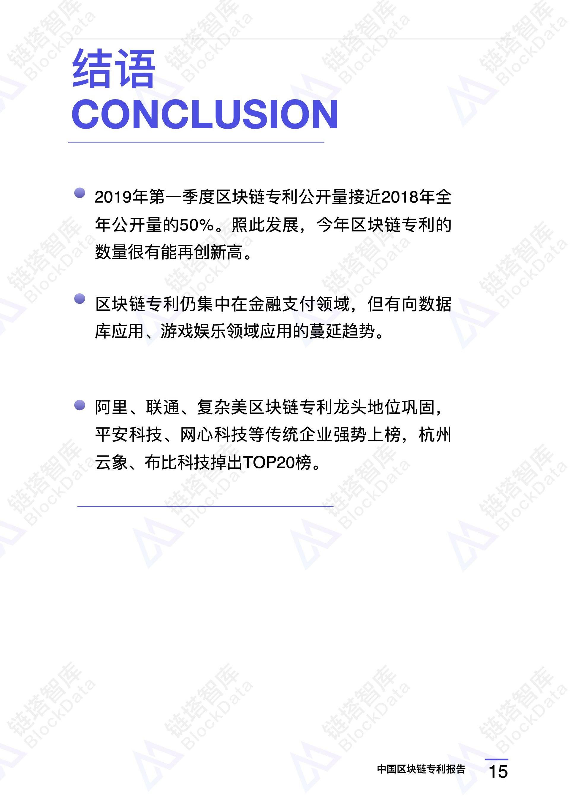 XRP/HKD+0.2%隨著區塊鏈數字貨幣市場回歸理性,區塊鏈技術逐漸受到大眾關注,無論是互聯網巨頭還是區塊鏈企業紛紛將目光鎖定至區塊鏈專利這一領域,在區塊鏈最終爭奪戰中,區塊鏈專利是不可或缺的一場戰役。根據國家知識產權局的統計,截止到2019年3月31日,中國公開的區塊鏈專利數量為4351項。2019年第一季度公開的專利數量總數為2041項,遠超2018年第一季度的317項,同比增長近6倍,接近2018年全年專利總量的一半。照此發展,今年區塊鏈專利的數量很有可能再創新高。鏈塔行研團隊研究發現,隨著數據庫、游戲娛樂方面的專利逐步公開,當前的專利熱點出現了逐漸從金融支付向數據庫、娛樂游戲方面蔓延的趨勢。地區分布方面,各省市的專利數量構成了明顯的階梯式結構,北京、廣東第一梯隊的地位較為穩固。本期TOP20區塊鏈專利企業排行榜,前三名仍為阿里巴巴、中國聯合網絡通信集團有限公司、杭州復雜美。其專利累計量分別為186、154、136項。本期新上榜企業有5個,分別是平安科技、網心科技、杭州趣鏈科技、全鏈通、深圳壹賬通智能科技。鏈塔將持續關注區塊鏈專利領域,本文為區塊鏈專利報告2019Q1期。