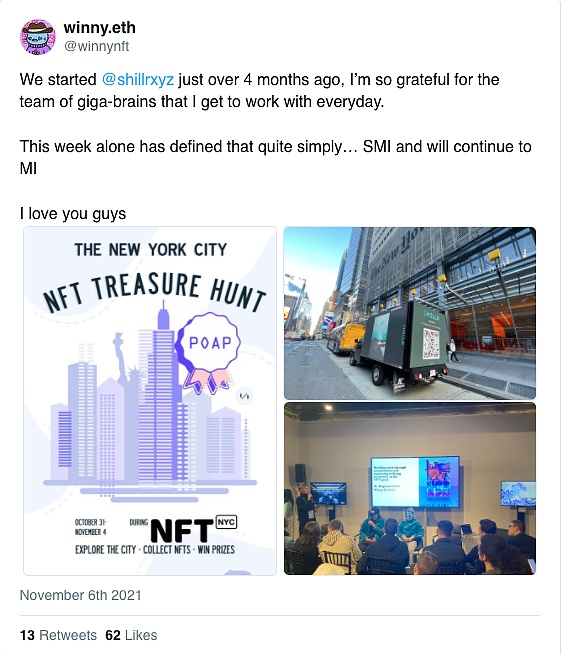 此外,SHILLR還參加了一些活動,從與POAP一起組織紐約市NFT尋寶活動,到參加NFT倫敦會議,以及駕駛SHILLR面包車在紐約市和邁阿密轉悠,他們已經開始在一些案例中為數字與現實搭建橋梁。