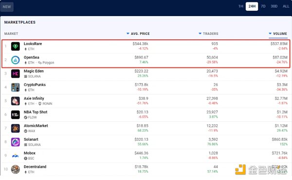 根據Dappradar 2022年1月25日數據,opensea日交易量為$537.85M,LooksRare日交易量僅為$87.02M,前者交易量明顯更大。