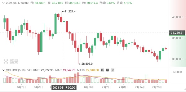 7月29日,美聯儲公布利率決議并召開新聞發布會。此次會議召開前,比特幣逐漸在“5.19”大跌的陰霾中恢復過來,雖然會議最終表述整體略偏鷹,但美聯儲依然維持利率不變,維持購債規模不變,市場在會議后略有下跌,然后繼續反彈之路。
