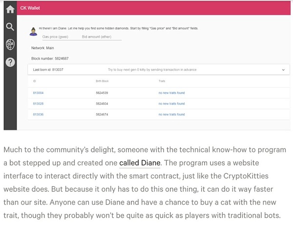 由于 CryptoKitties 是開源且可擴展的,因此更多的社區成員設計了其他自動化機制。一個團隊開源了一個特殊用途的客戶端,允許用戶在具有新特征的貓甚至在 CryptoKitties 網站上呈現之前對它們進行競標。