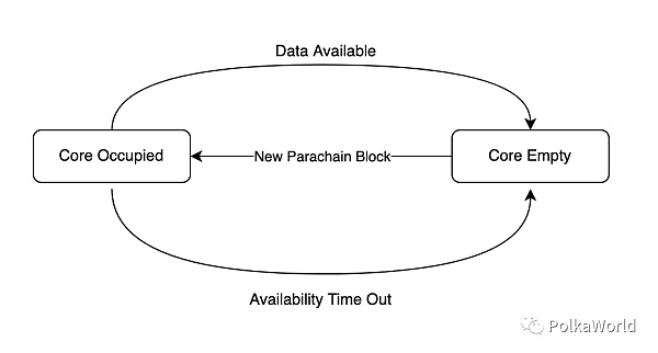 一旦平行鏈區塊在鏈上得到支持(即,它的區塊頭與選定驗證人的證明一起出現在中繼鏈區塊中,并且通過了各種健全性檢查),它就開始占據可用性內核。
