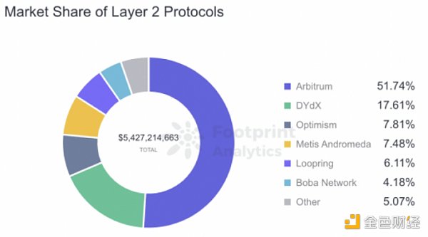 以ETH網絡上最大的Layer2項目Arbitrum為例:其鎖定總價值高達2.8億美元,占L2市場份額的51.74%,TVL方面遙遙領先。Arbitrum通過降低成本和提高效率為構建可持續的基礎設施,高效、安全地為吞吐量更大的DApp提供動力。