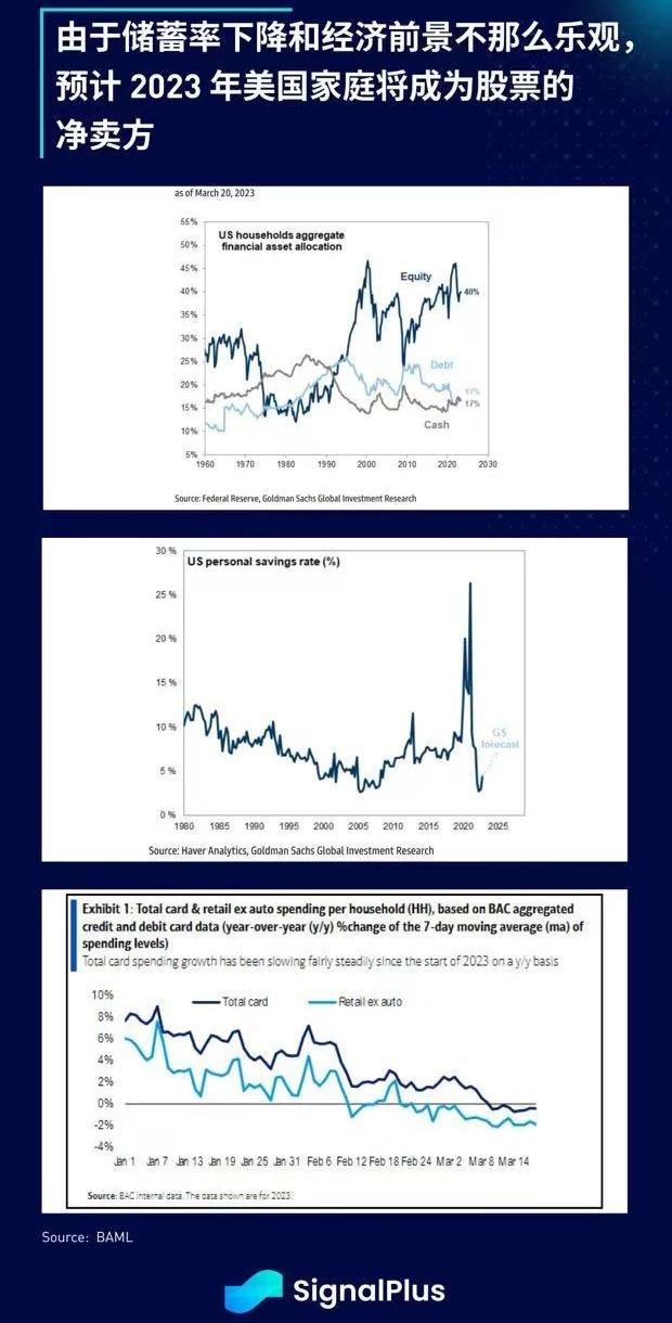 -由于儲蓄率下降和經濟前景不那么樂觀,預計2023年美國家庭將成為股票的凈賣方。美國家庭的整體財富水平已顯著增加,如今儲蓄率下降,而儲蓄收益率卻出現有吸引力的增幅,預計他們會將部分股票資產重新配置到生息資產中;此外,較高頻率的信貸數據顯示,今年以來消費者支出與去年同期相比持續下降。