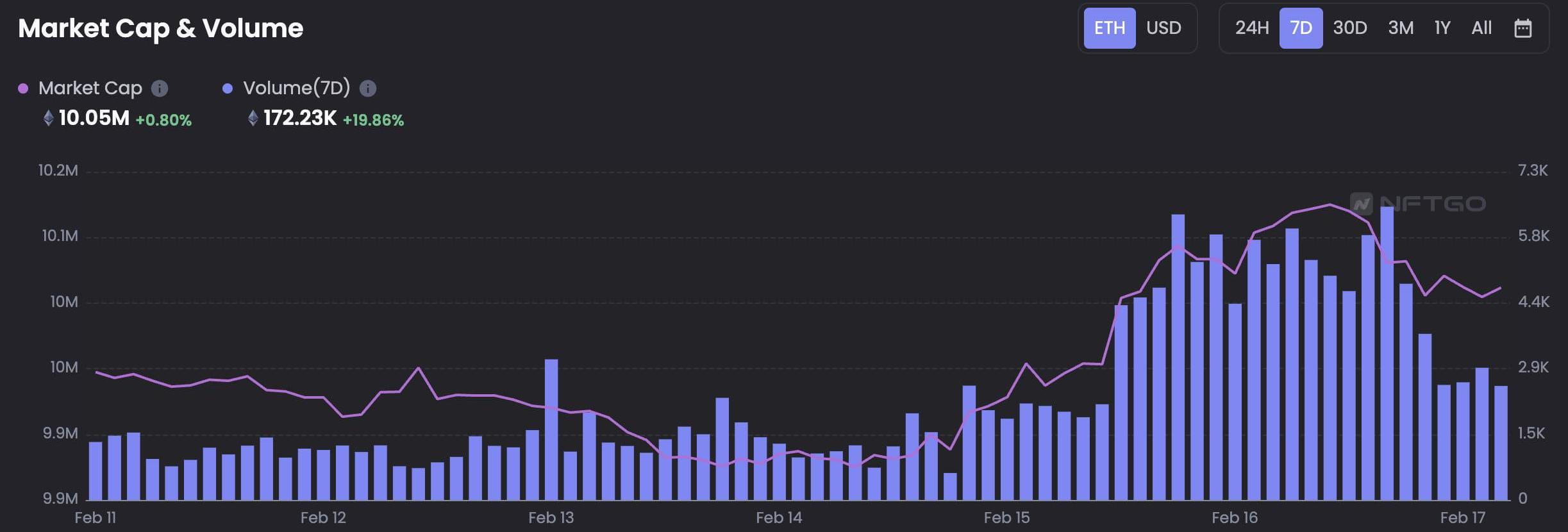 市場概況:本周NFT藍籌指數表現是非常樂觀的,在呈現了兩周的下跌趨勢之后從上周初開始有了一個小幅度的穩定拉升,較上周相比也有了一定程度的上漲,藍籌指數也是回到了30天前的位置,截止2月17日,NFT藍籌市場有一個回暖的趨勢,市場熱度也是在近半年來首次接近了一個中立的位置。