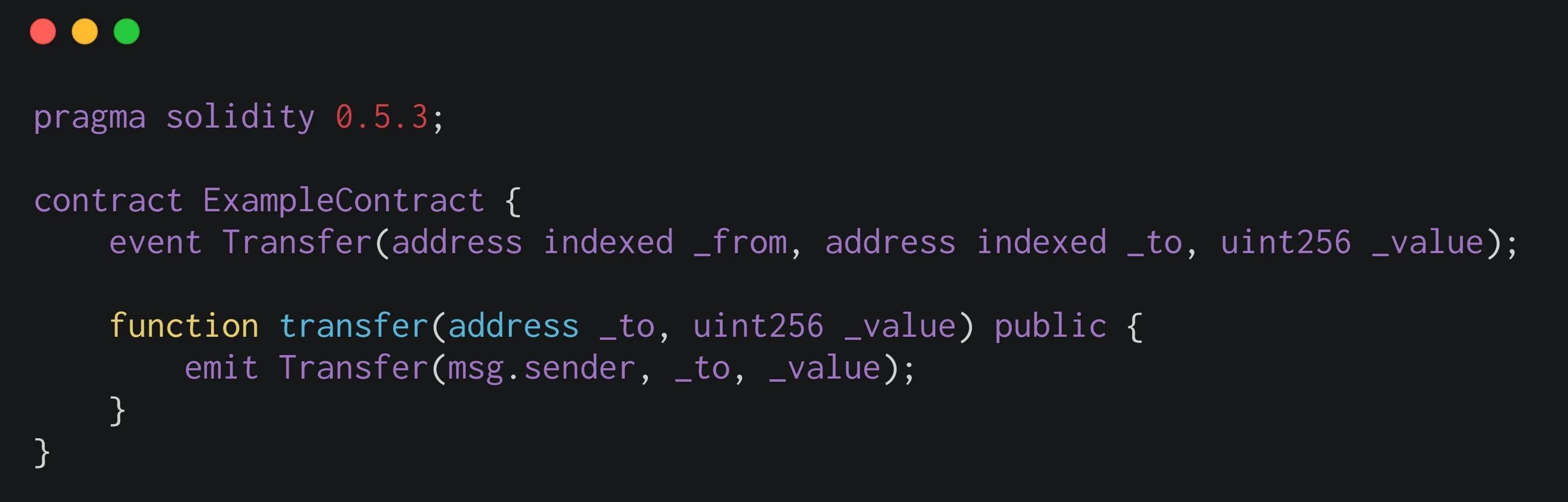 接下來以一個實例進行說明觸發事件,下面的代碼實現了符合ERC20標準的代幣合約所使用的轉賬事件。