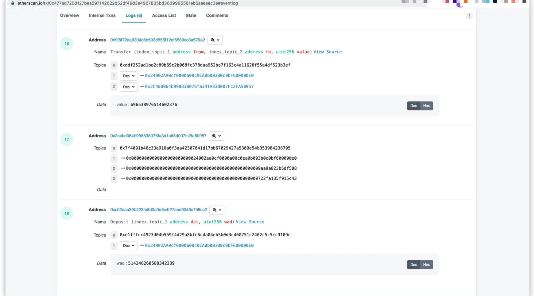 我們隨意點開一條交易(0x477ed7208127bea597142622d52df46d3e4967835bd3609995581eb5aaeeec3e),查看其日志Logs。