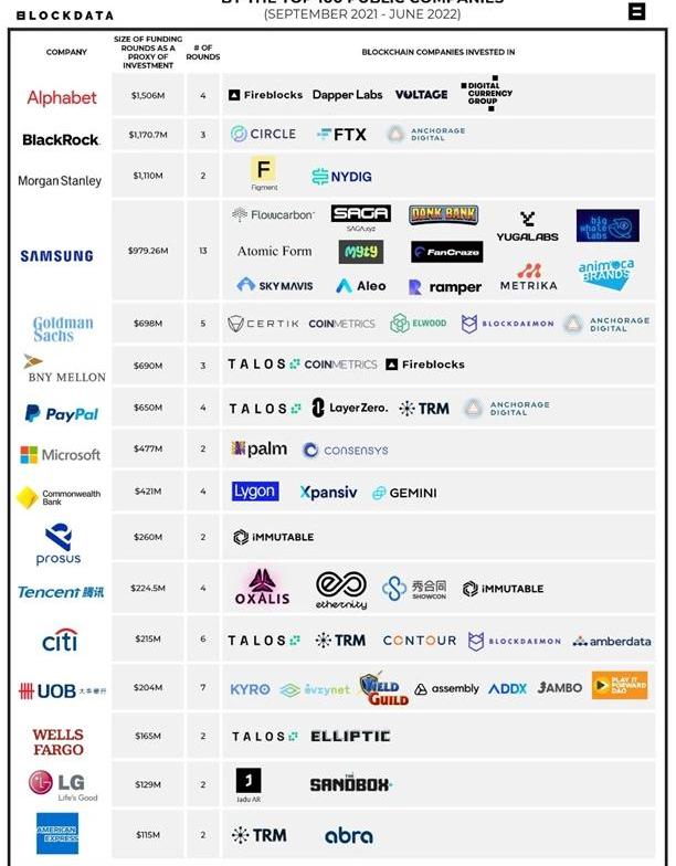 根據Blockdata近期披露數據,三星集團通過旗下投資子公司SamsungNext參與了包括YugaLabs、SkyMarvis、AnimocaBrands在內的17個crypto項目投資,投資主題為Metaverse-oriented;