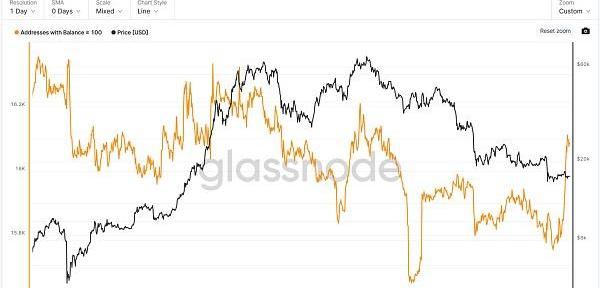 BTC地址數:持幣100以上地址數開始逐步放緩