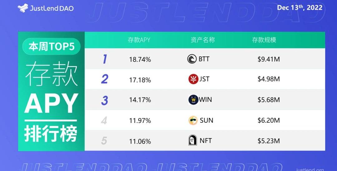 XRP/HKD-2.13%最新數據顯示,截至12月13日,JustLendDAO借貸市場中存款APY最高的是BTT,達到18.74%,其次是JST和WIN,分別達到17.18%、14.17%。此外,SUN、NFT的存款APY也十分可觀,均超過11%。