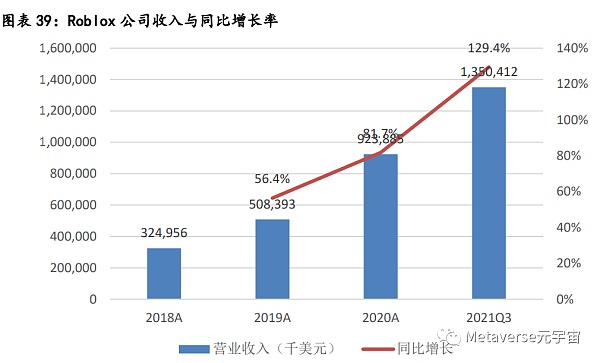收入增長迅猛 公司收入幾乎全部來自于 Roblox 平臺,其余收入包括廣告,許可證等收入。隨著 社區用戶規模的增長以及 UGC 內容的火爆,公司收入得到了迅猛提升,2021 年前三季度收入錄得 13.5 億美元,同比增長 129%,主要源自于活躍用戶數和在線時長的快速提升。