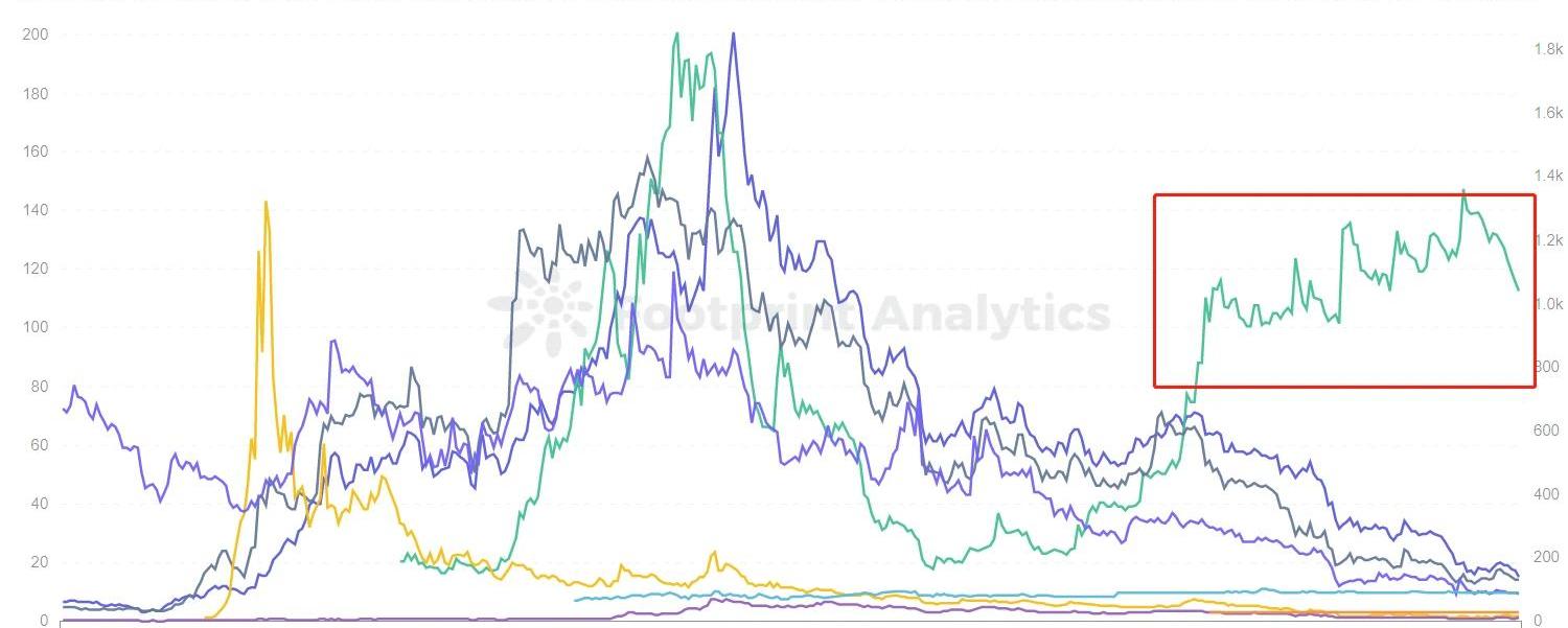 而GameFi其他的數據表現也不盡人意,FootprintAnalytics顯示: