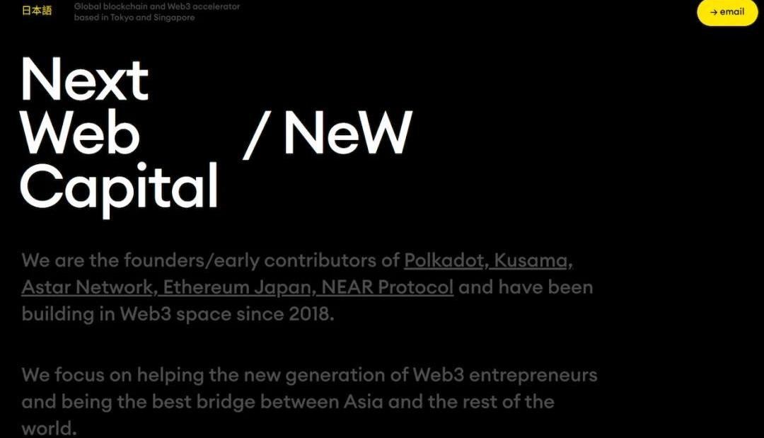 NextWebCapital是位于東京和新加坡的全球區塊鏈和Web3孵化器的投資公司,由Polkadot、Kusama、AstarNetwork、EthereumJapan、NEARProtocol的創始人或早期貢獻者組成。