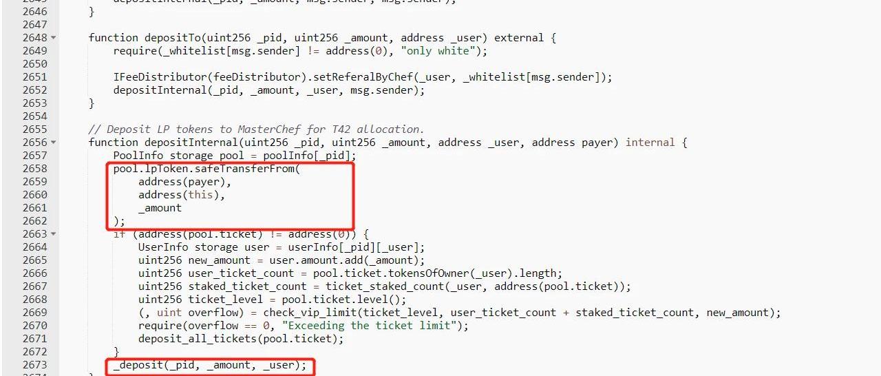 然后加上惡意合約的transferFrom調用deposit()時也會調用_deposit函數存入LP代幣到用戶地址,就相當于獲取了兩份LP代幣。