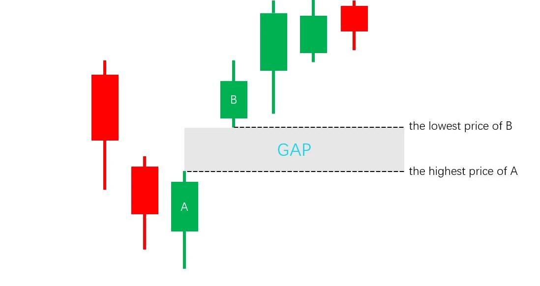 如下圖所示,相鄰的兩個K線A和B之間的這段灰色區域即為一個缺口。這表明在該價格區域內,沒有發生任何交易。
