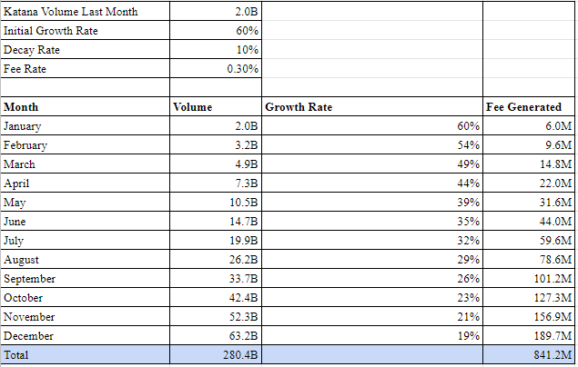 根據以上數據──我們可以外推一個 Katana 未來一年的增長曲線。從我的角度來看,我采用了最近 30 天數據 20 億交易量這個數字并且預測下一年數據。我們假設 Katana 會以 60% 月環比增長,并且增長率每個月遞減 10%。這樣我們可以計算出一年的交易量大約會在 2800 億美元。這仍然是一個保守估計,僅僅 ETH 一條鏈上,過去一年的交易量大約在 1.5 萬億美元。保守估計,所有鏈上的 DEX 交易量或許在 ETH 的 3 倍左右──大約是 4.5 萬億美元,我們就假設 Ronin 能夠捕獲 2800 億美元的交易量,也就是大約 5% 的全網交易量。Katana 的手續費模式是 0.25% 返還 LP,0.05% 進入 Ronin 的國庫。為了計算方便,我們把這 0.3% 作為協議收入。這樣,我們以這樣的假設,給 Katana 做一個收入統計以便我們進行估值: