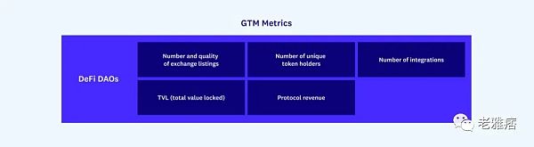 DeFi DAO的上市指標:隨著web3新的上市策略的出現,衡量成功的新方法也隨之而來。對于DeFi應用程序,典型的成功指標是前面提到的總價值鎖定(TVL)。它代表了所有使用協議或網絡進行交易、押注和借貸等的資產。