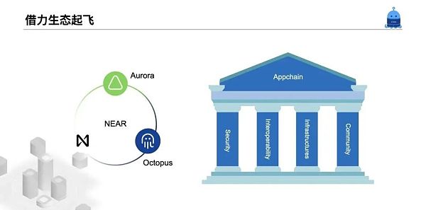 NEAR 生態還有個開發鐵三角。除了 NEAR 原生智能合約開發,還支持 AURORA 極光的 EVM 開發。最主要的目的是以太坊的 DeFi 協議能夠非常容易地移植過來。第三個角就是 OCTOPUS 章魚網絡,是圍繞 NEAR 建立的應用多鏈網絡。每條應用鏈是一條獨立鏈,有幾十個節點。應用鏈跟 NEAR 主鏈有無縫的跨鏈,跟以太坊可以做有雙向的資產跨鏈。