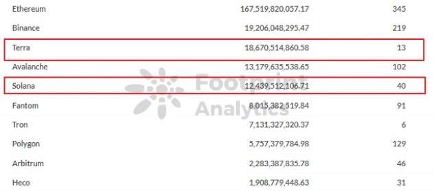 目前Top10的公鏈兼容EVM的情況。從公鏈TVL看,非EVM兼容公鏈數量雖然少,但Solana以及Terra今年在整體TVL中占比超過11%,已從激勵的公鏈競爭中占得一席之地。