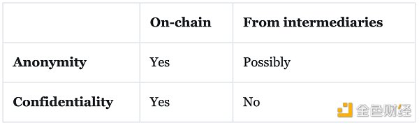上述兩種區塊鏈應用的分類為我們提供了一個額外的軸來考慮隱私問題:鏈上隱私與來自中介機構的隱私。