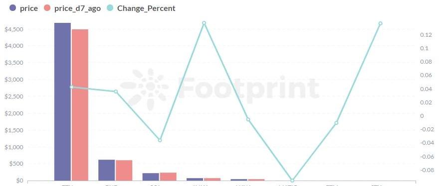 本周鏈的代幣價格,第一位ETH;本周上升最快的為AVAX,漲幅為13.73%,當前金額84.82美元。