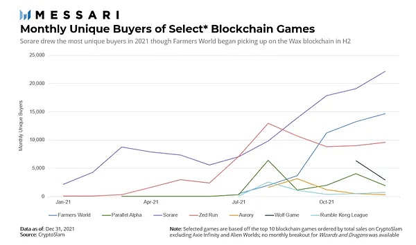 上圖:幾大主流區塊鏈游戲的每月 NFT 買家數量變化情況。