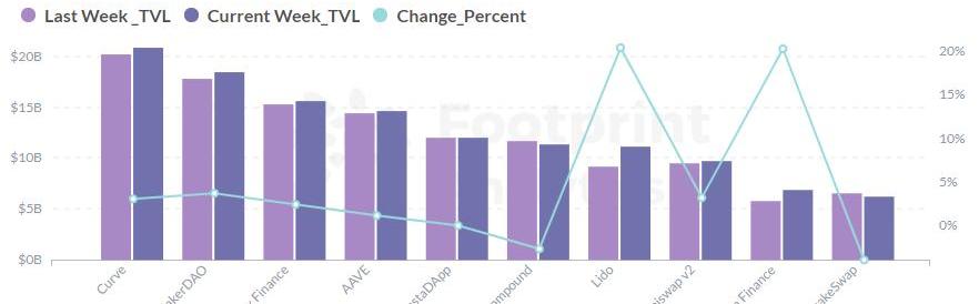 從各個協議上看,最高的TVL是Curve,本周上漲3.11%,第二是MakerDao,本周上漲3.66%。