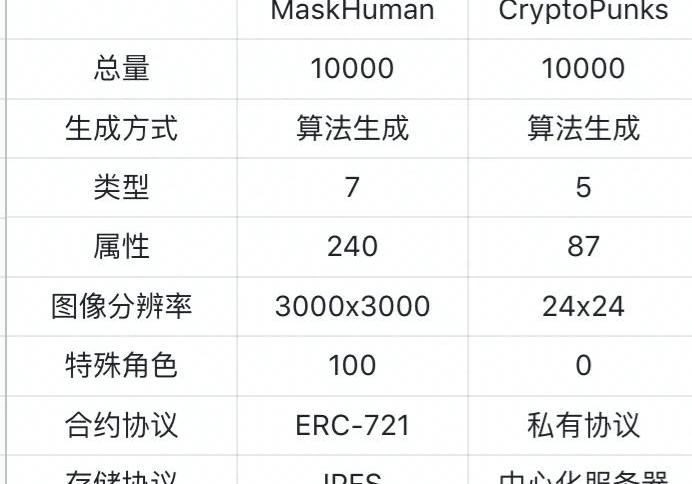 與CryptoPunks類似,MaskHuman都是基于EC-721協議,發行10000枚,具有稀缺性。不過CryptoPunks代表著暗黑朋克文化,MaskHuman代表群體自覺。以下為兩者的詳細對比。