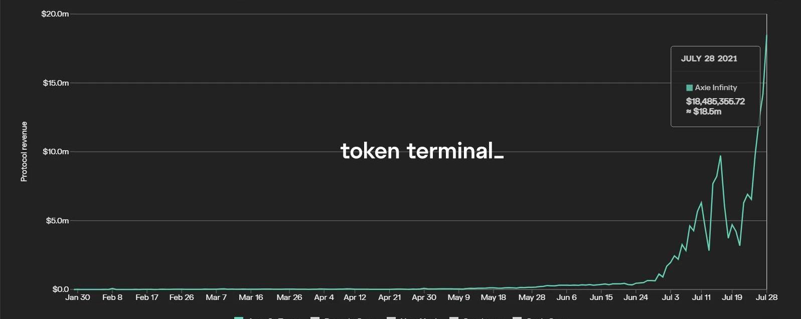 7月30日,據TokenTerminal數據,NFT游戲項目AxieInfinity單日收入破4000萬美元,超王者榮耀三倍。近30天收入超1.67億美元,續創歷史新高,霸榜DeFi協議收入榜首位。