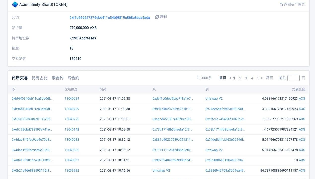 關于AxieInfinity項目代幣和交易可根據TokenviewNFT鏈上數據工具查詢或點擊鏈接:https://eth.tokenview.com/cn/token/0xf5d669627376ebd411e34b98f19c868c8aba5ada