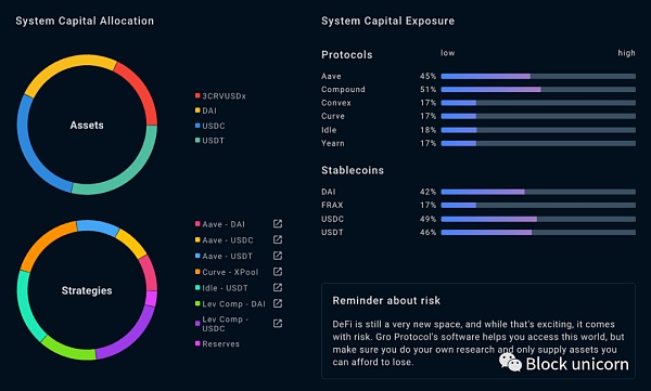 產量優化器的另一個很好的例子是Gro Protocol。[全面披露:我是 Gro Protocol 的去中心化營銷部門 G-Force 的成員,并且未授予 GRO。] Gro 是一個風險分檔的穩定幣收益優化器,因此它接受 USDC、USDT 和 DAI 等資產。它將這些存入下游的許多不同協議中,以產生交易費用(即來自 DEXes)、借貸收入(即來自借貸池)和協議激勵(即治理代幣),并將它們清算回原始穩定幣。?