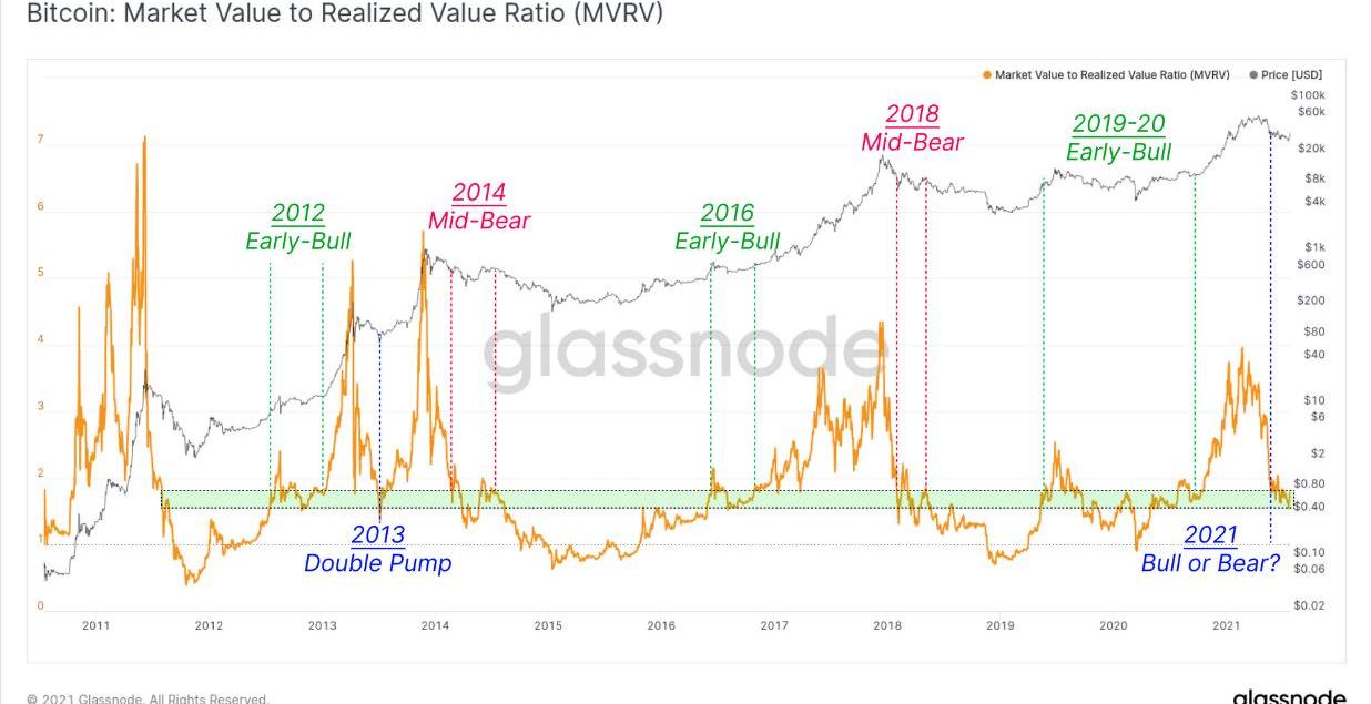在過去的市場周期背景下,MVRV被用來比較市值與已實現市值的比率。如上圖所示,歷史上,關于MVRV和幣價的周期有三種情況:
