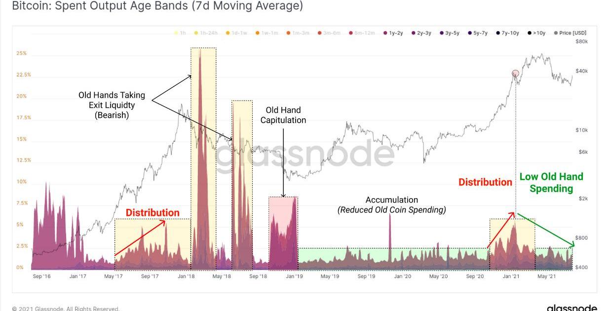 最后,再看看是否有老玩家通過此次反彈獲利了結。如上圖所示,在2018年初見頂下跌之后的反彈中,持有時長>1年的籌碼支出顯著增加,這種情況預示市場進入熊市。與2018年初的情形不同,目前持有時長>1年的籌碼總體仍處于休眠模式,表明長期持有者的HODL意愿仍然強烈,后續行情相對樂觀。