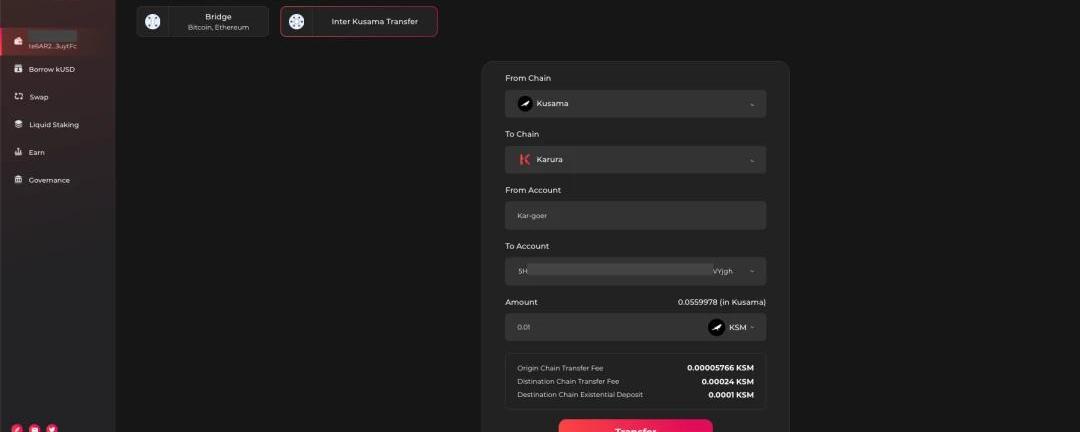 使用Karura前端操作平臺,點擊「CrossChain」,選擇「InterKusamaTransfer」。請注意,你在Karura操作平臺中所登陸的帳戶必須要有一些KSM來滿足ExistentialDeposits,以保證帳戶可用。