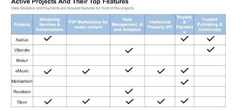 許多試圖將區塊鏈與音樂集成的公司此后成為先驅。專注于數字內容管理和數據分析的項目包括,例如Viberate全球音樂網絡、Verifi媒體、Musiclife、eMusic和Blokur分布式數據庫和星際文件存儲.Viberate成立于2015年,擁有最大的現場音樂數據庫,擁有來自超過400,000個不同流派的超過400,000名表演者,包括獨立樂隊、車庫樂隊和新興搖滾樂隊。