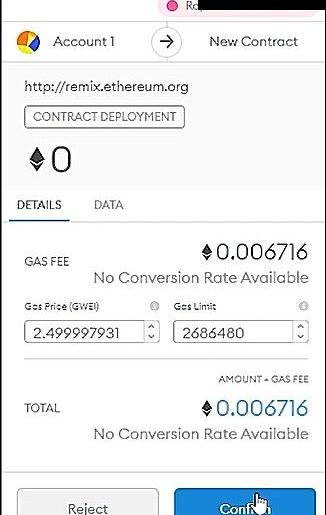 單擊確認繼續并部署合同。在這種情況下,我們在測試Ether中支付我們的gas費用,但如果你使用的是以太坊網絡,您將不得不向礦工支付實際費用。