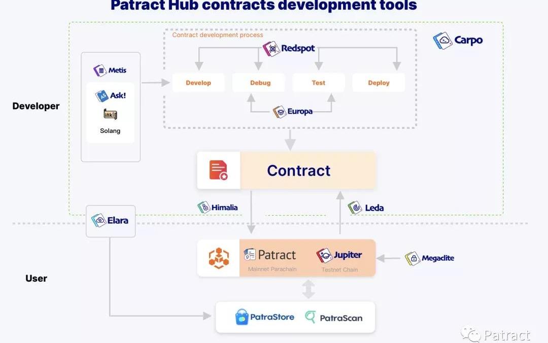 Wasm合約模塊是Parity新開發的高級智能合約技術,相比于以太坊的EVM合約,它有更高的性能,還支持使用高級語言(Rust、C++、AssemblyScript等)編寫更復雜的業務邏輯。同時依托于即將爆發的波卡生態,Wasm合約終將超越EVM合約,成為未來合約技術演進的必然方向。Parity和Web3主要專注在合約運行環境(FRAMEContracts)和基于Rust的ink!語言的開發上,而在過去的半年里,Patract通過波卡國庫10個議案的支持,補足了周邊關鍵的開發工具和運行環境支持:包括基于AssemblyScript的Ask!語言,ZKP支持Megaclite,開發腳手架Redspot,運行沙盒Europa,節點API服務Elara,多語言SDKHimalia等。同時即將發布DApp應用商店PatraStore,后續將繼續合約瀏覽器PatraScan,合約標準庫Metis,合約監控臺Leda,云端IDECarpo的開發。Patract圍繞著完整的合約開發流程:開發-調試-測試-部署,對每個環節設計相應的工具,輔佐合約開發者更輕松的開發合約。