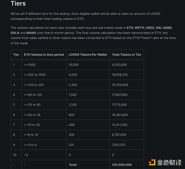 LooksRare 則是以其原生代幣 $LOOKS 為賣點,向所有在 6 個月內在 OpenSea 上至少交易 3 ETH 的 NFT 用戶發放空投,$LOOKS 代幣的空投有九個等級——用戶在 OpenSea 上交易的次數越多,可以領取的 $LOOKS 代幣的數量就越多。