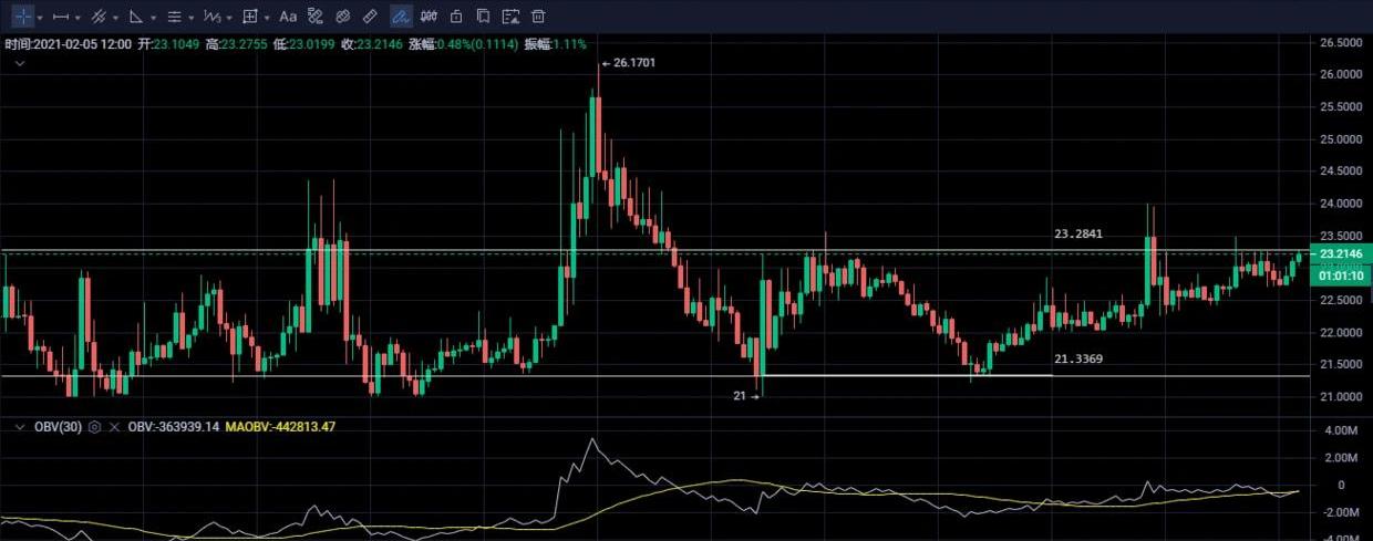 盡管說它未來的價值可期,但從4小時圖上看,它至少目前還是屬于一個震蕩期間的代幣,可以把上方23.3美金附近當做它的一個短期的壓力位,如果突破并企穩,那將可能才會帶來新的一輪上漲。