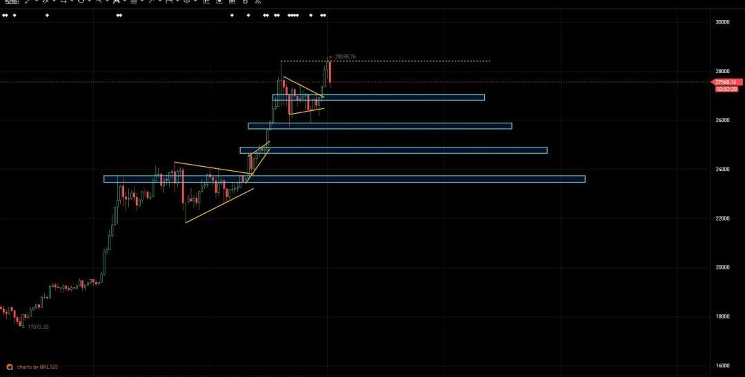 如圖所示,比特幣在27000附近再次構成三角收斂,并于上期報告中所說25700附近得到支撐,隨后二探超買形成的前高壓力位28422,雖未有效突破前高,甚至沒有站上28000,但已慣性回補上周周線上影線價格部分;同時二探確認了短期壓力位28500,若站穩28000,則有機會繼續沖高,下方短期支撐為27000附近,中期仍觀察25700和24700附近。