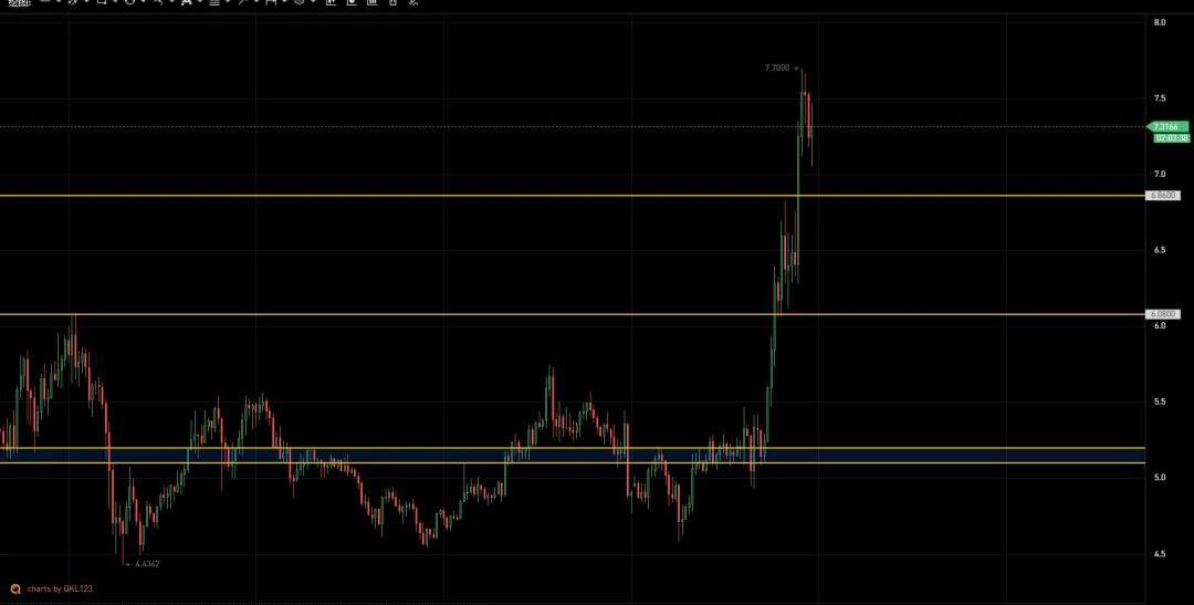 如圖所示,波卡在最近兩天的行情中表現突出,拉升幅度超50%,主要受事件驅動,一方面受波卡插槽拍賣的影響,另一方面三大所一致開啟波卡質押挖礦模式,對市場籌碼流通產生較大影響;下方6.8和6附近為短期支撐,中期關注5.1-5.2區間支撐強度。