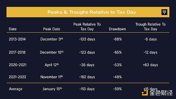 納稅日對加密貨幣價格可能很重要。 在經歷了 2013 年、2017 年和 2020 年的三個大上漲之后,以及 2021 年的這一次上漲之后,比特幣在稅收日前 35 天達到頂峰,然后隨著投資者拋售資產以支付 2020 年累積的稅款,比特幣跌至當時低谷。 一些意義。 許多加密貨幣交易者是投資新手。