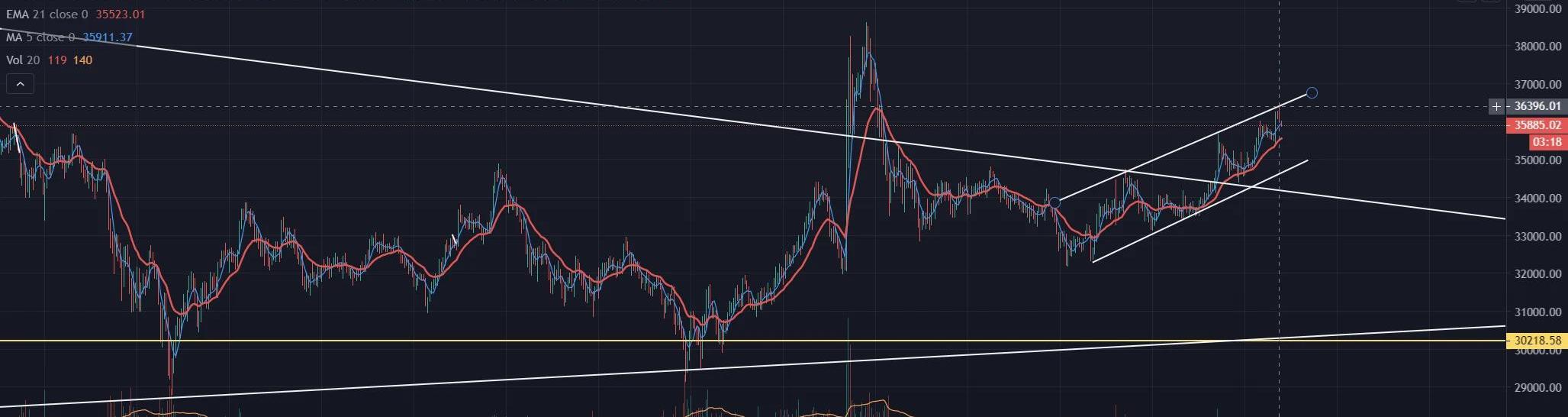 我們提醒投資人,從技術上來看,比特幣仍處于突破下行阻力位的上行通道內,今日早晨挑戰該通道上沿失利,正在調整重新繼續的力量。一旦比特幣價格有效突破36500美金,則意味著將會開啟加速上漲行情。