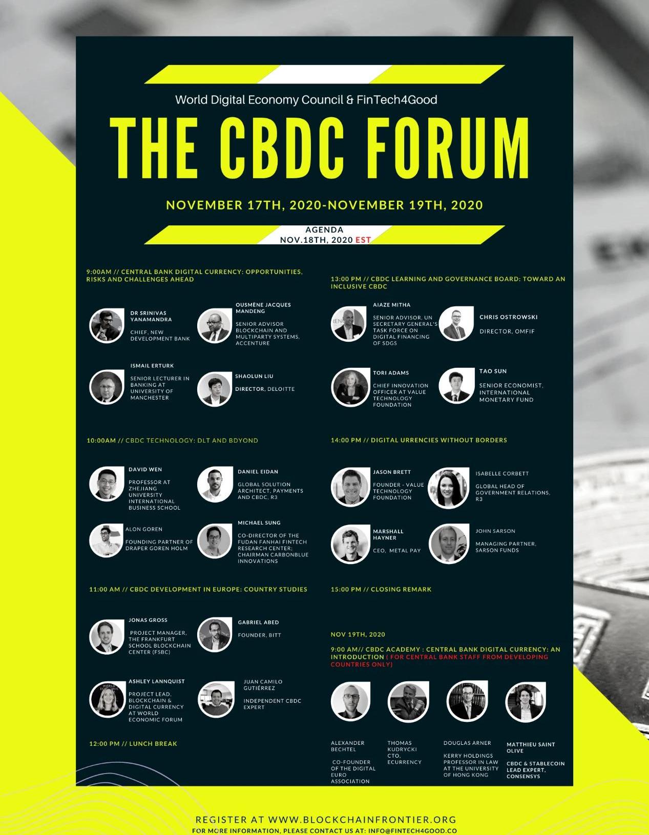 為了促進知識普及、經驗分享以及跨境合作,由世界數字經濟理事會和Fintech4Good主辦的「全球央行數字貨幣論壇TheCBDCForum」將于2020年11月17-18日在華盛頓舉行。本次論壇匯集了包括來自國際貨幣基金組織、世界銀行、加拿大央行、泰國央行、巴西央行、西班牙央行、多米尼加央行、R3、畢馬威、埃森哲、世界經濟論壇、Consensys等知名機構的官員、專家、學者及一線從業者等近40位演講嘉賓。除了會議之外,中央銀行數字貨幣學院還將為來自6個發展中國家央行的30位官員提供中央銀行數字貨幣項關的培訓。