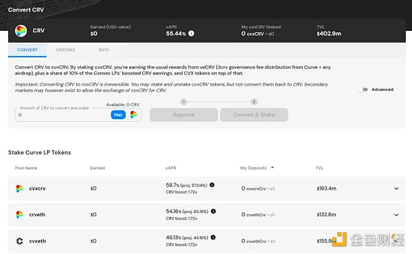 訪問convexfinance.com/stake并在可用的CRV或Curve LP代幣礦池中進行選擇。請注意,將CRV轉換為cvxCRV進行質押是沒辦法反悔的。然而,你仍可以通過二級市場取消質押和交易cvxCRV。
